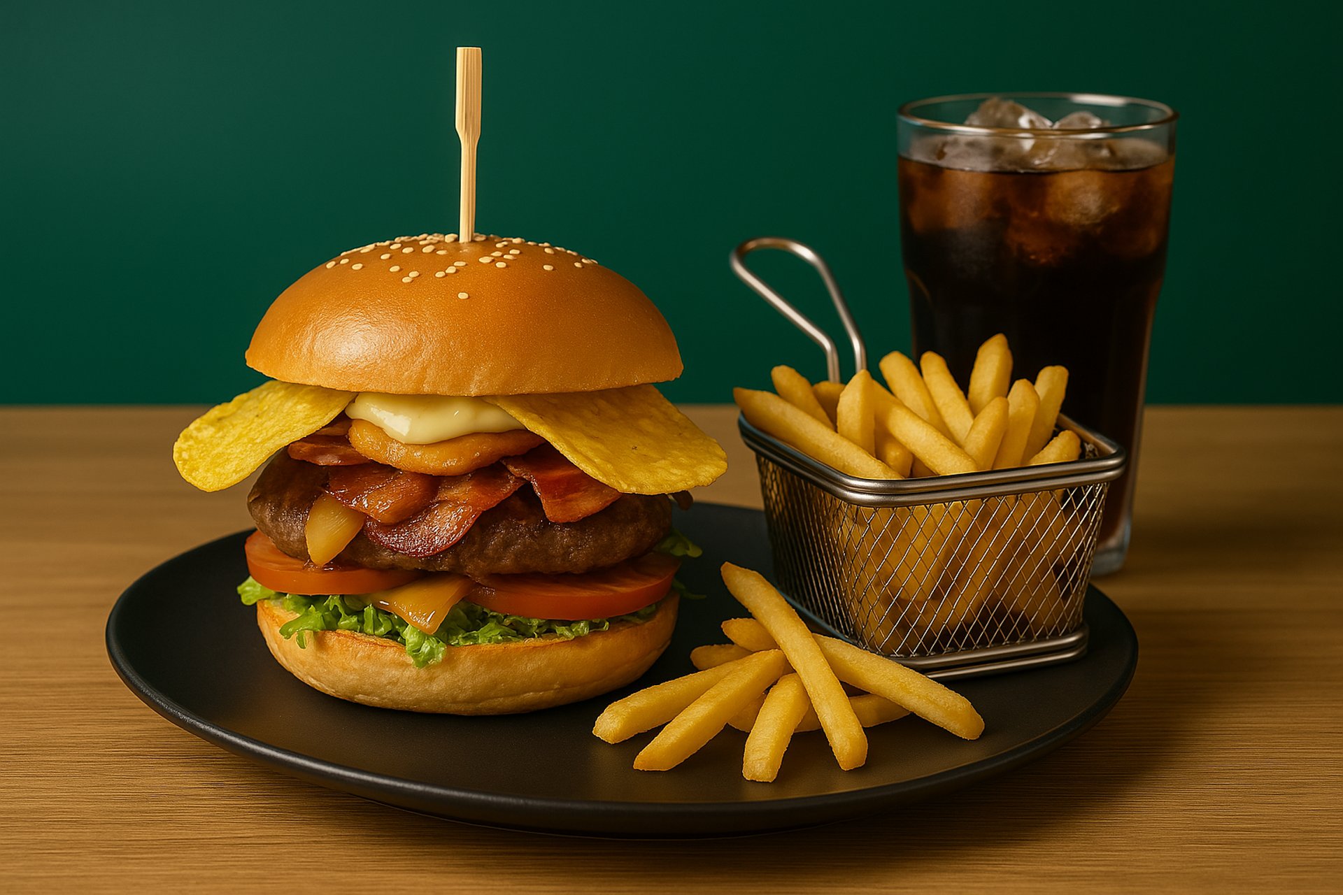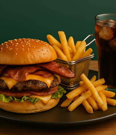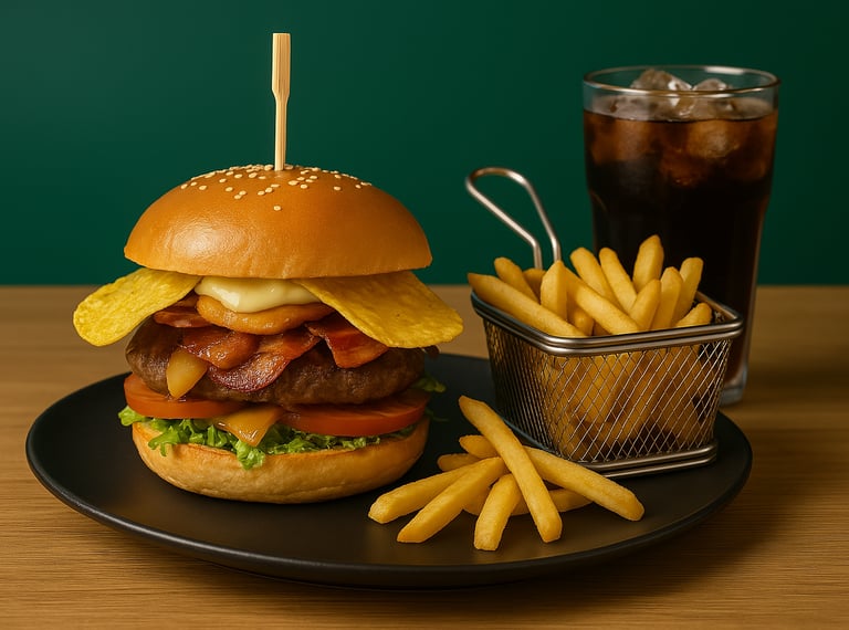 Déjate seducir por la CHONCHITA, la joya que conquistó el segundo lugar en el Burger Master Guatecano. Un suave pan artesanal abraza 150 g de carne de res jugosa, realzada con lonjas de jamón ahumado y tocineta crujiente. Cada bocado despierta la dulzura de la cebolla caramelizada y el abrazo del queso cheddar, todo realzado por nuestra salsa Chonchis secreta. La frescura de lechuga y tomate, coronada con el crujiente explosivo de nachos de plátano, convierte esta hamburguesa en un viaje inolvidable de sabor y emoción